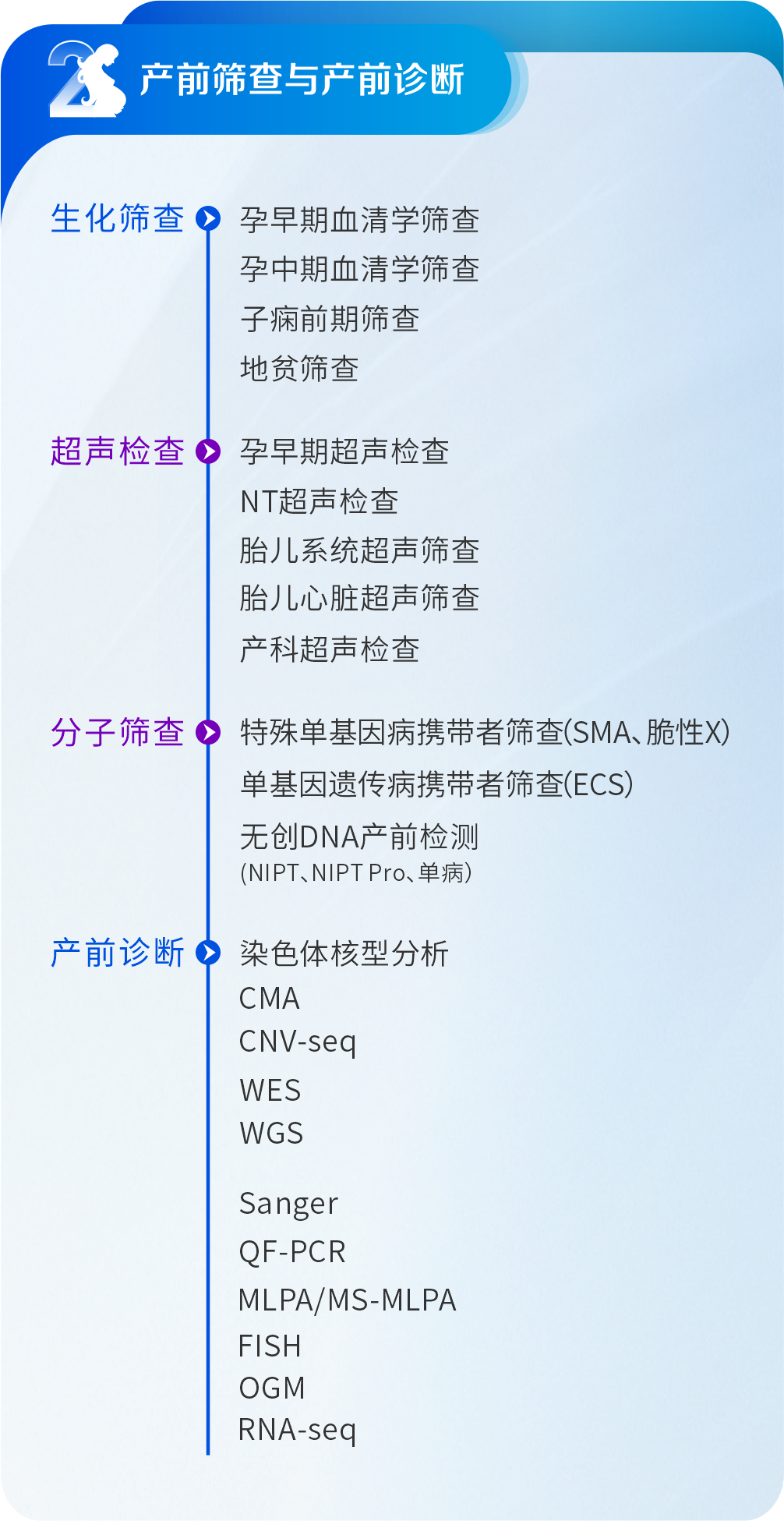 产前筛查和产前诊断作为出生缺陷二级预防的关键环节,主要是通过生化筛查、影像学检查、无创筛查、单基因筛查、细胞和分子遗传学诊断等,有效识别胎儿的严重先天缺陷,早期发现,早期干预,减少缺陷儿的出生。