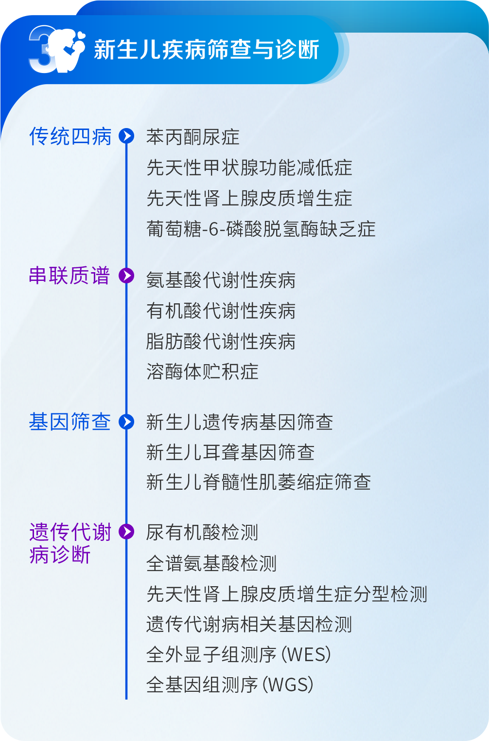 针对新生儿疾病的早期筛查,早期诊断,及时治疗,避免或减少致残,提高患儿的生活质量。新生儿遗传代谢病筛查是指在新生儿早期通过快速、简便、敏感的实验室检测方法,对危及儿童生命、影响生长发育、导致智力障碍的一些先天性遗传代谢疾病进行筛查,早期诊断、早期治疗、及时预防疾病的系统服务。根据检测技术主要分为生化筛查和基因筛查。